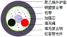 產品型號: GYSTS也叫(GYTS) 光纖松套管 金屬中芯加強件 纜芯填充油膏 軋紋鋼帶粘結PE護套 | |||